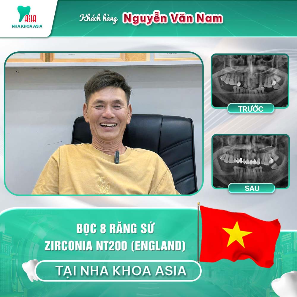 Anh Nguyễn Văn Nam từng gặp nhiều bất tiện vì răng xỉn màu, không đều, khó vệ sinh, khiến anh ngại giao tiếp và mất tự tin trong công việc. Ngoài ra, răng yếu khiến việc ăn nhai không thoải mái, đôi khi gây đau nhẹ khi nhai đồ cứng. Sau một thời gian tìm hiểu, anh quyết định đến Nha khoa Asia để thăm khám. Tại đây, sau khi được bác sĩ tư vấn chi tiết về các giải pháp thẩm mỹ, anh Nam chọn bọc 8 răng sứ Zirconia NT200 – dòng sứ cao cấp nổi bật với: Độ bền chắc cao; Màu sắc trắng trong tự nhiên như răng thật, Tính tương thích sinh học tốt, an toàn với cơ thể.