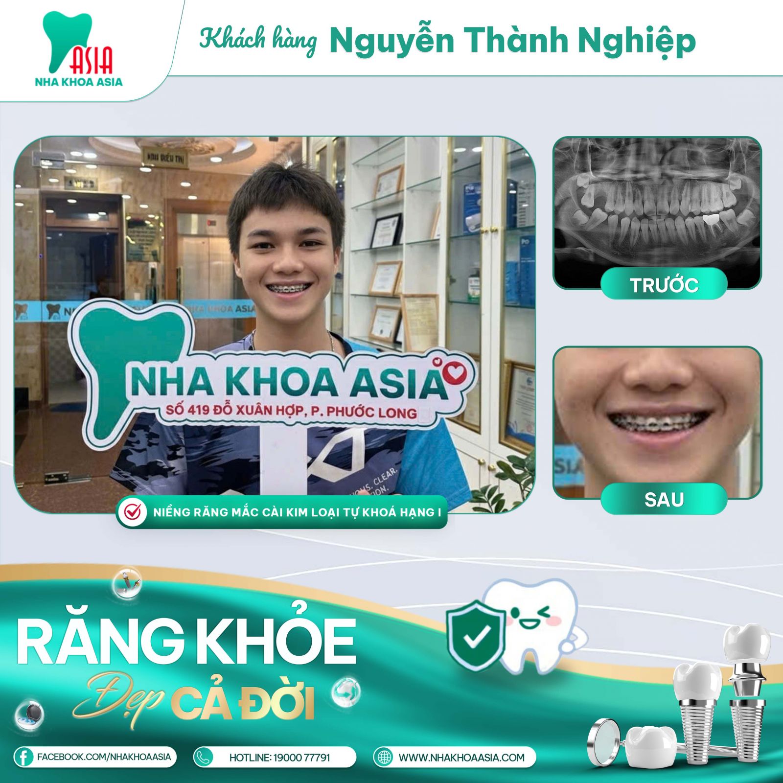 Bạn Nguyễn Thành Nghiệp đã lựa chọn niềng răng mắc cài kim loại tại Nha Khoa Asia để cải thiện tình trạng răng chưa đều, giúp nụ cười hài hòa và tự tin hơn.