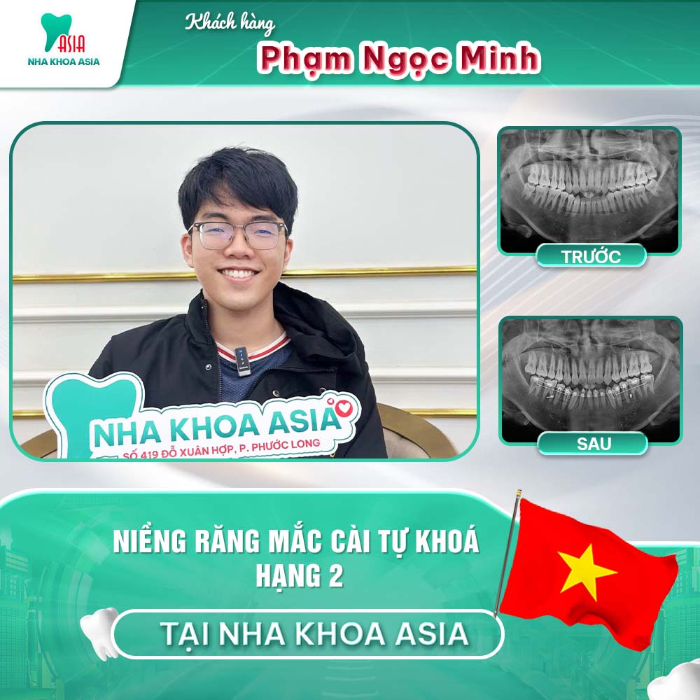 Trong suốt quá trình điều trị, anh Minh cho biết anh rất hài lòng với chất lượng dịch vụ tại Nha khoa Asia. Mọi quy trình – từ thăm khám, tư vấn, chụp phim X-quang đến gắn mắc cài – đều được thực hiện chuẩn xác, chuyên nghiệp và nhẹ nhàng, giúp anh cảm thấy thoải mái, không lo lắng hay đau đớn như anh từng nghĩ trước đây.